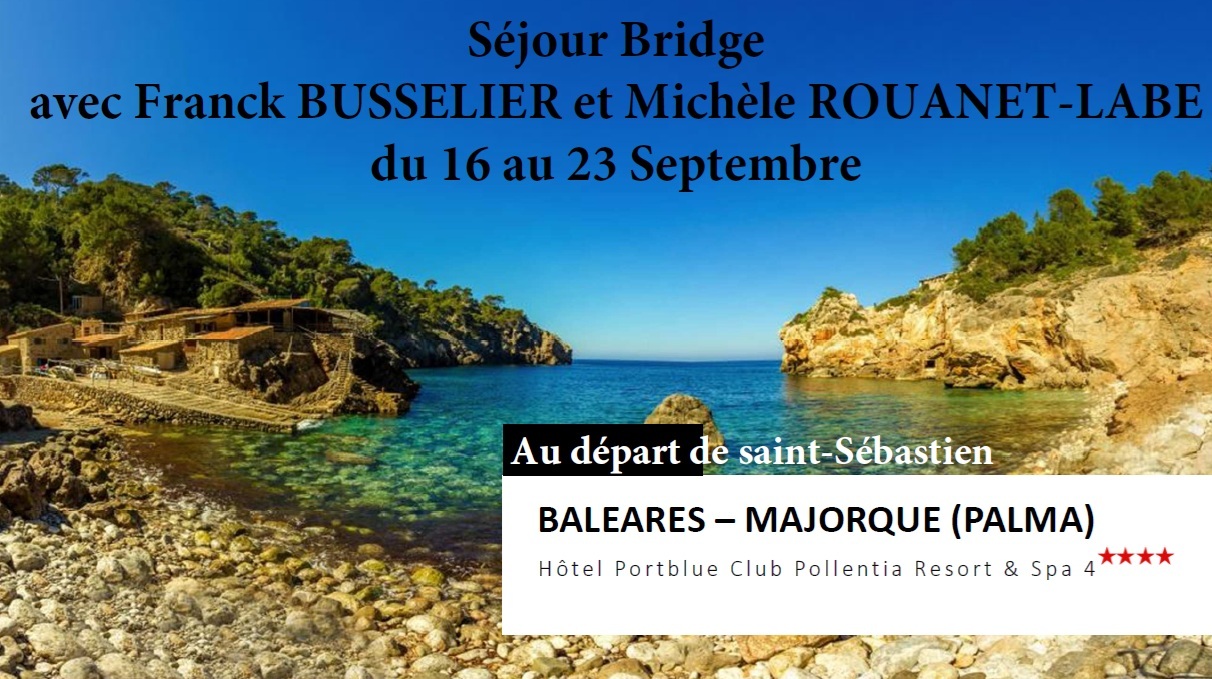 Vous trouverez, via les liens suivants, une proposition de séjour à Majorque (Baléares) du 16 au 23 septembre 2026 avec un stage de bridge organisé par Franck Busselier et Michèle Rouanet-Labé :